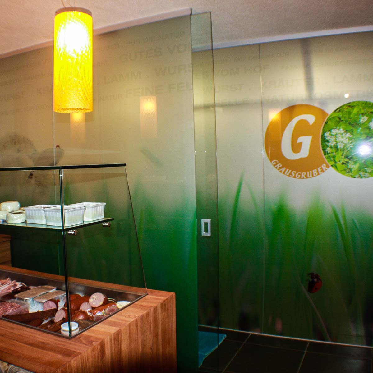 Bedruckte Sandstrahlfolie für die Veredelung von Glasflächen. Kann auch noch Konturgeschnitten werden um besondere Effekte zu erzielen. Auf Wunsch mit mattem Schutzlaminat für erhöhte Kratz- und UV-Beständigkeit.