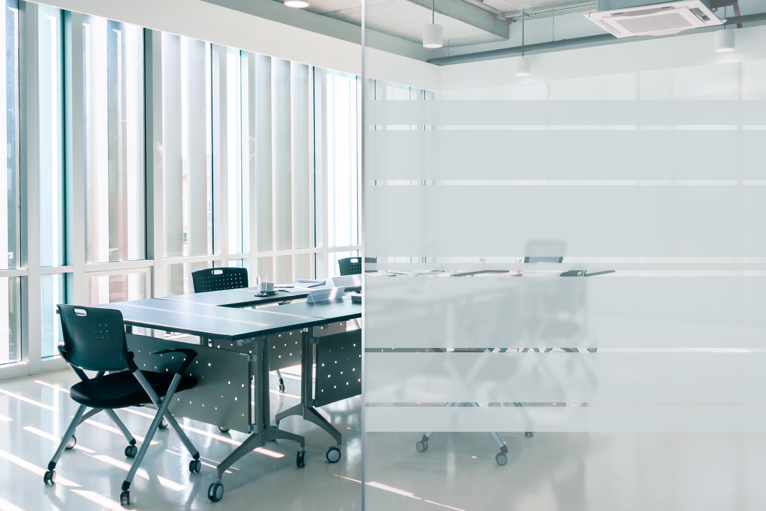Sandstrahlfolie mit seidenmatter, transparenter Oberfläche für die Verklebung auf Glas – vermittelt den Eindruck einer sandgestrahlten Oberfläche. Wird auch als Glasdekorfolie oder Satinatorfolie bezeichnet.