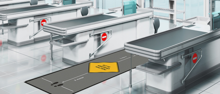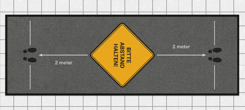 Die Sicherheitsabstands-Fußmatte die neben wirkungsvollem Schmutzfang auch eine Warnhinweisfunktion übernimmt. Kunden, Gäste und Mitarbeiter werden daran erinnert, ausreichend Distanz zu halten. Die Farben der Sicherheitsabstands-Fußmatte sind kräftig und langlebig. Der Mattenrücken besteht aus 100 % Nitrilgummi und sorgt für eine sehr gute Rutschsicherheit.